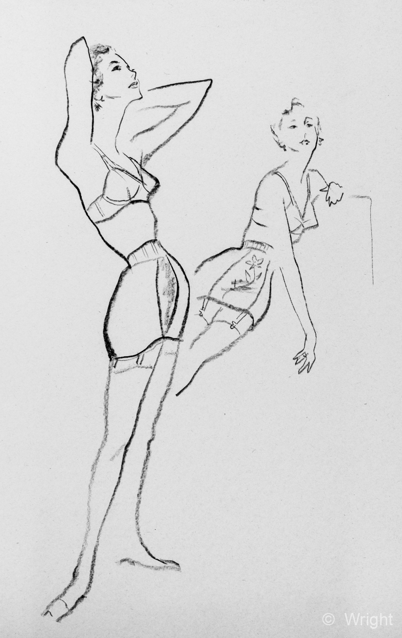 Doris B Wright worked in fashion illustration during the 1950s and 1960s. These are pieces which would have been printed in magazine or newspaper advertisements. Click the image for a larger view — thumbnails along the bottom allow you to scan ahead and click to pieces of interest.