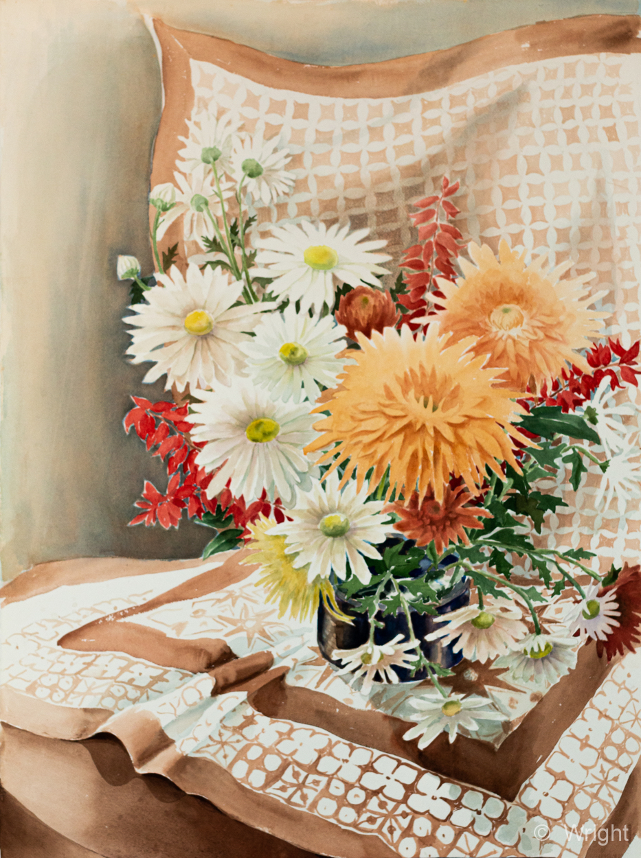 Doris B Wright loved watercolors, and painted in watercolor extensively throughout her career. Click the image for a larger view — thumbnails along the bottom allow you to scan ahead and click to pieces of interest.